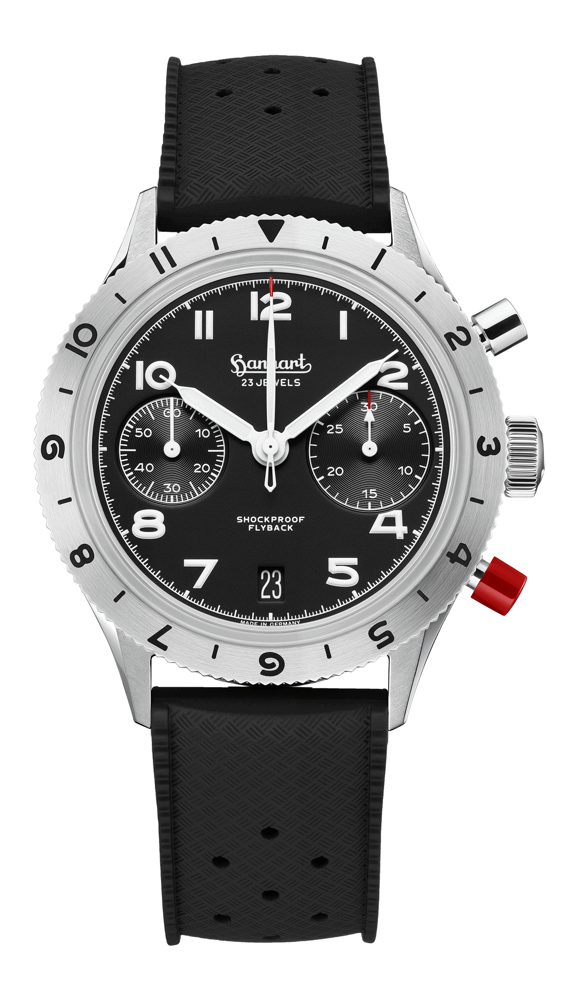 In keeping with the original design of this historic watch, Hanhart has chosen to use the vintage Hanhart logo on the dial, crown and buckle, as well as the "shockproof", and "flyback" designations on the dial.