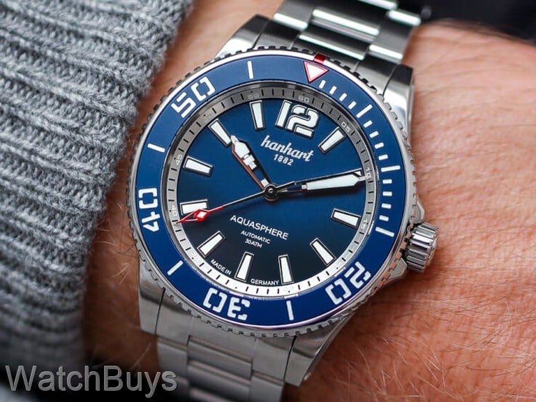 The Hanhart Aquasphere Ocean Fade features a unidirectional 60 click bezel with a ceramic insert and a red indicator.