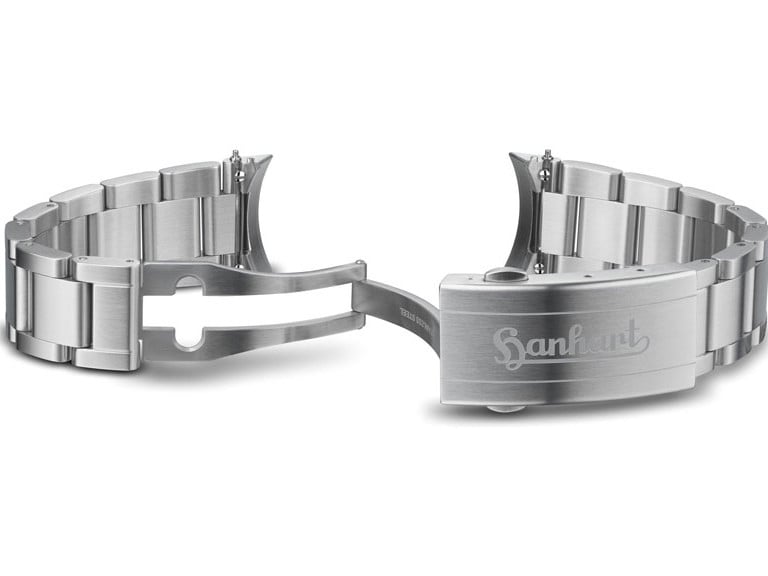This hardened steel bracelet, designed for the new Hanhart Preventor HD12, has a satinized finish and a folding clasp with Hanhart's historical logo.