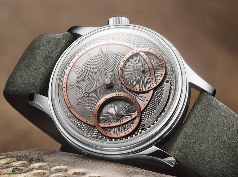 The positioning of the hour and minute hands is shifted slightly toward the 12 to make room for the smaller registers, similar to watches featuring subscription complications. This special watch features a rotating moon phase disc visible through a cutout in the sweep seconds register.