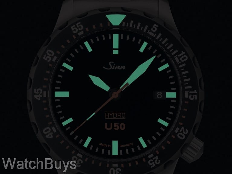 In line with the other Sinn U Series watches, the Sinn U50 Hydro SDR case is made from German submarine steel by SUG in Glashutte, Germany and features a black Tegimented (hardened) bezel.